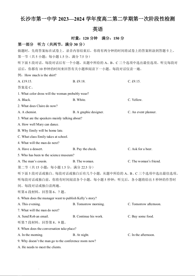 湖南省长沙市第一中学2023-2024学年高二下学期第一次月考英语+答案