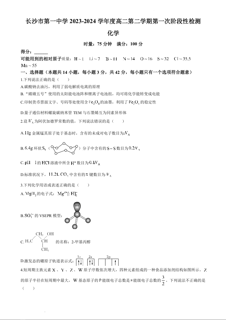 湖南省长沙市第一中学2023-2024学年高二下学期第一次月考化学+答案