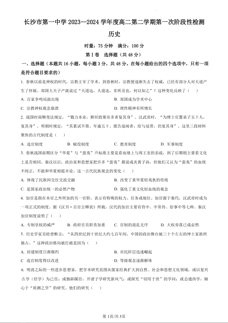 湖南省长沙市第一中学2023-2024学年高二下学期第一次月考历史(原卷版)
