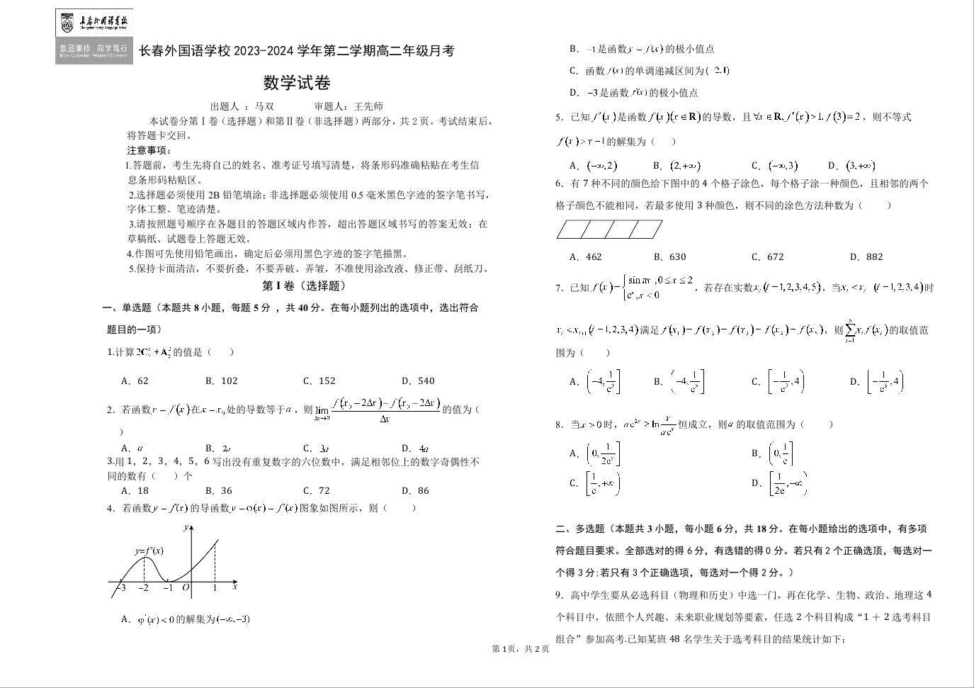 吉林省长春市朝阳区长春外国语学校2023-2024学年高二下学期4月月考数学+答案