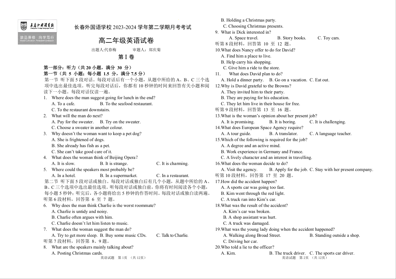 吉林省长春市朝阳区长春外国语学校2023-2024学年高二下学期4月月考英语+答案