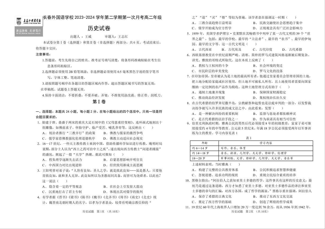 吉林省长春市朝阳区长春外国语学校2023-2024学年高二下学期4月月考历史+答案
