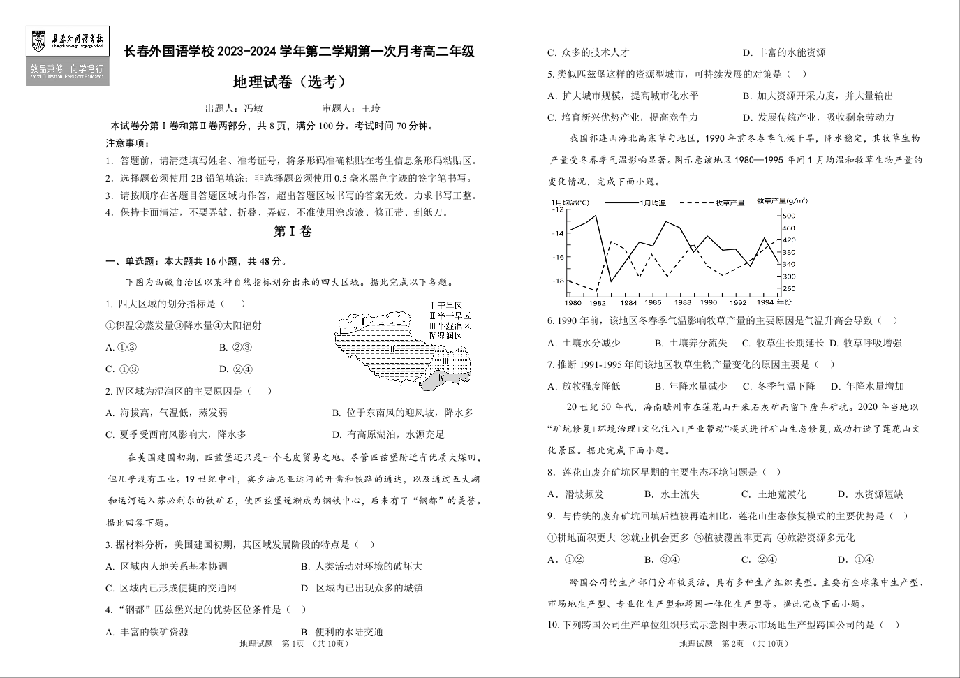 吉林省长春市朝阳区长春外国语学校2023-2024学年高二下学期4月月考地理+答案
