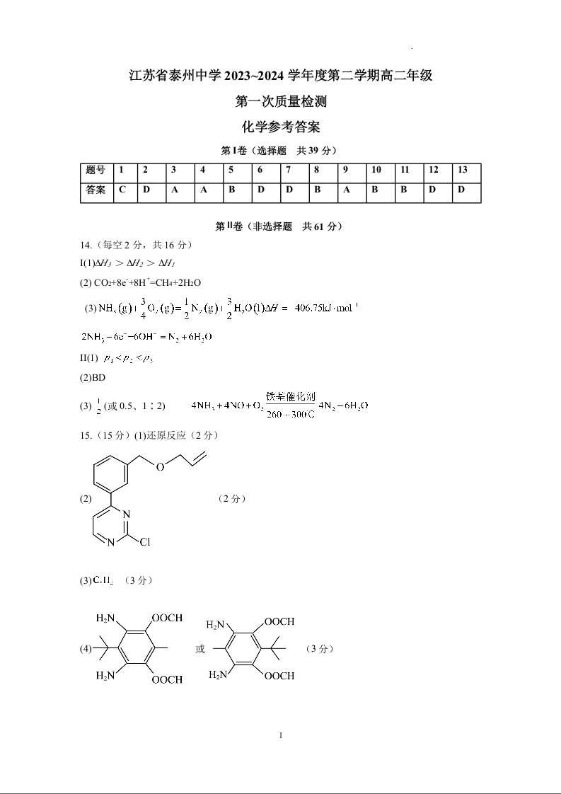 江苏省泰州中学2023-2024学年高二下学期4月月考化学答案
