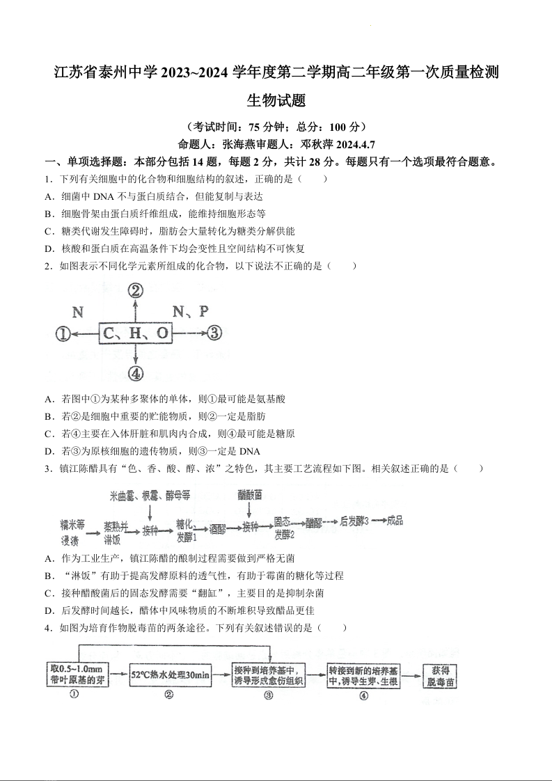 江苏省泰州中学2023-2024学年高二下学期4月月考生物