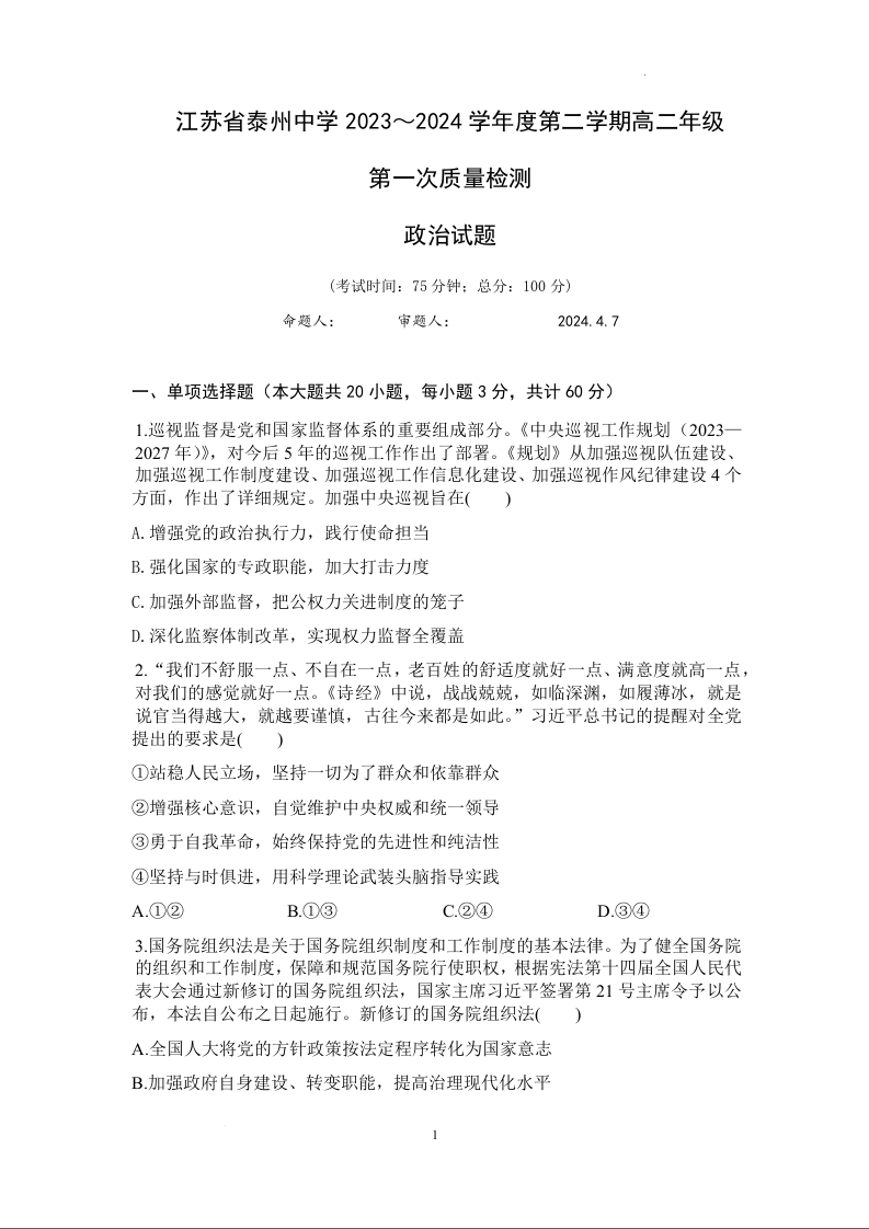 江苏省泰州中学2023-2024学年高二下学期4月月考政治+答案