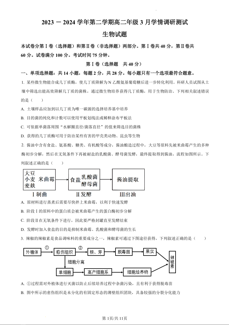 江苏省扬州市高邮市2023-2024学年高二下学期3月月考生物(原卷版)