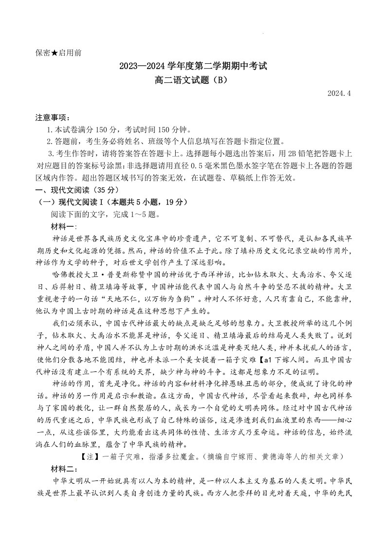 山东省菏泽市2023-2024学年高二下学期期中考试语文
