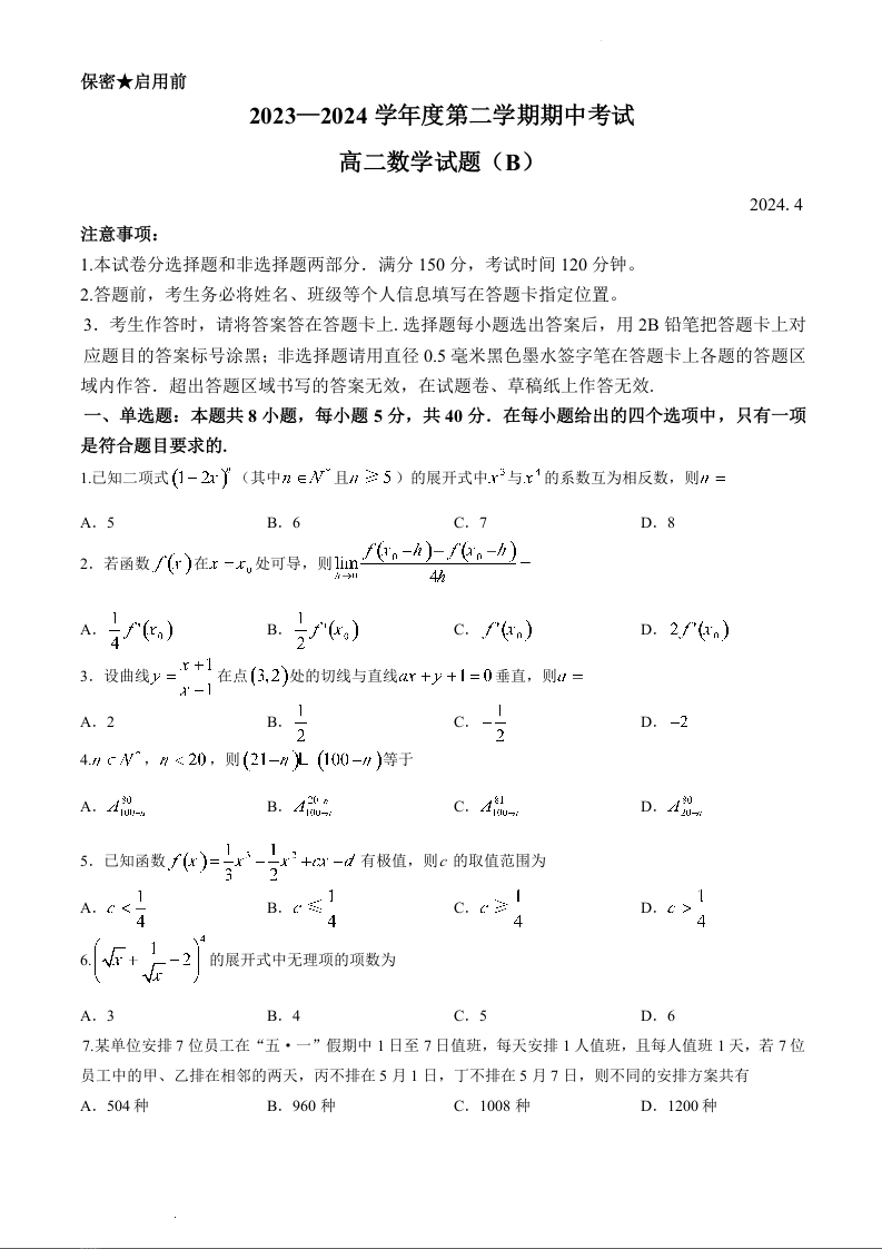 山东省菏泽市2023-2024学年高二下学期期中考试数学