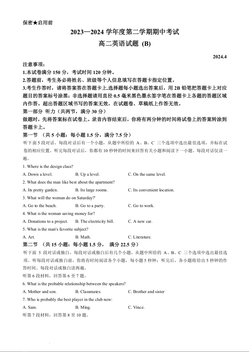 山东省菏泽市2023-2024学年高二下学期期中考试英语+答案