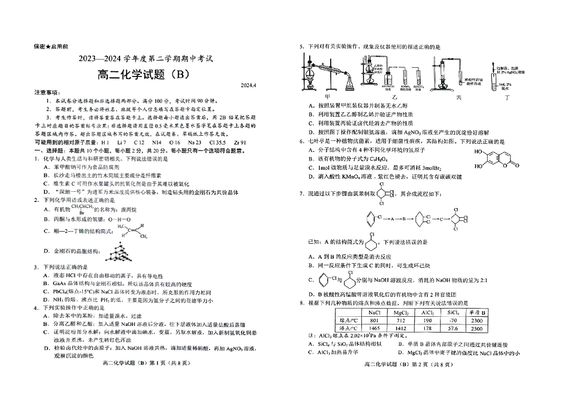 山东省菏泽市2023-2024学年高二下学期期中考试化学