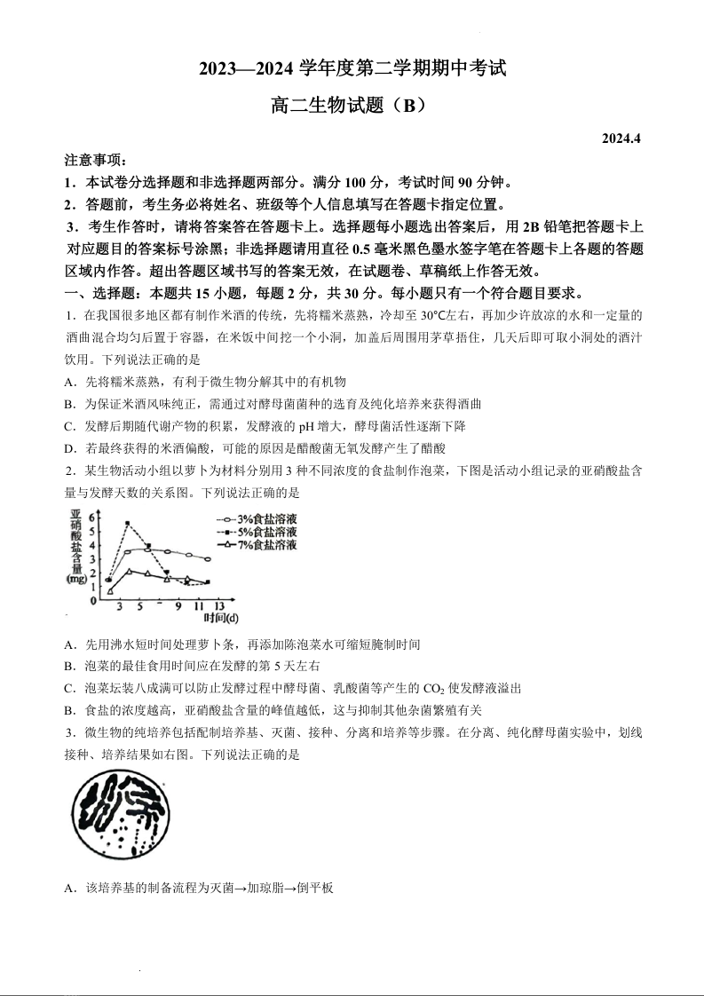 山东省菏泽市2023-2024学年高二下学期期中考试生物