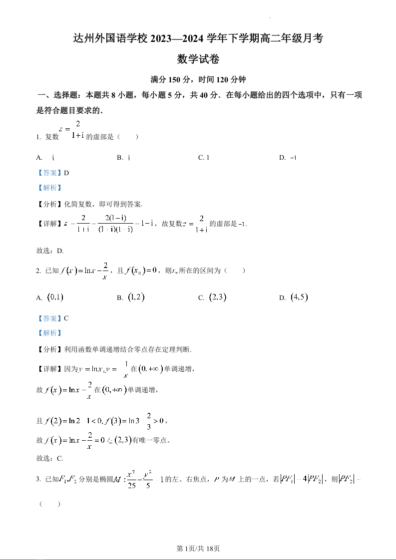 四川省达州市外国语学校2023-2024学年高二下学期3月月考数学(精品解析版)