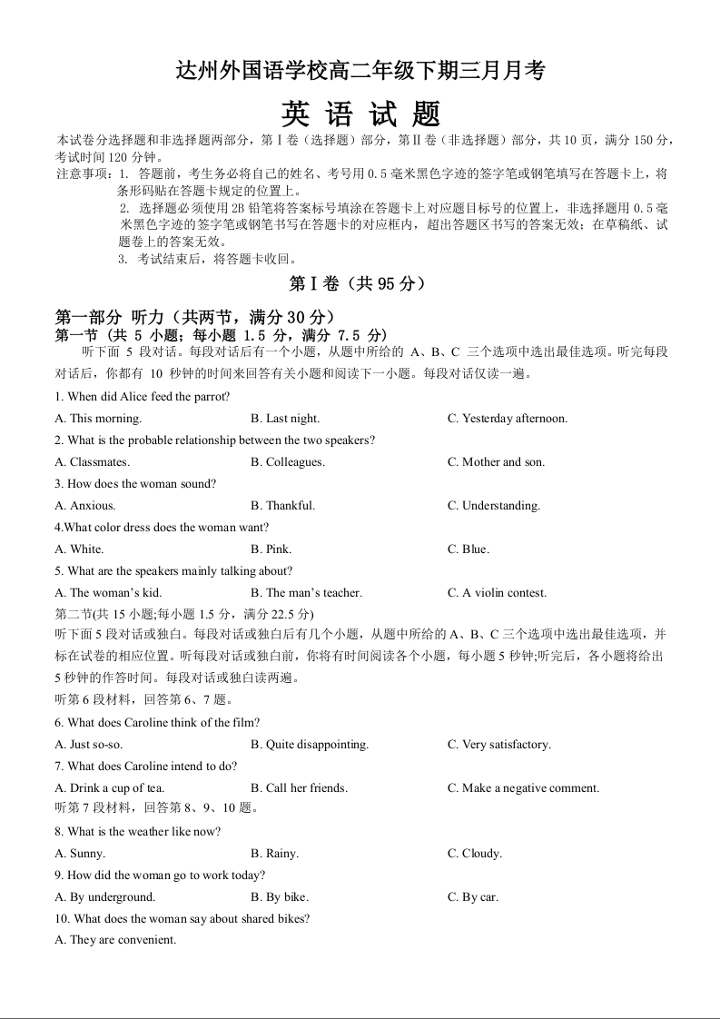 四川省达州市外国语学校2023-2024学年高二下学期3月月考英语+答案