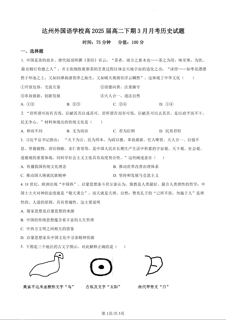 四川省达州市外国语学校2023-2024学年高二下学期3月月考历史(原卷版)