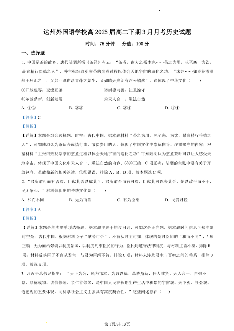 四川省达州市外国语学校2023-2024学年高二下学期3月月考历史(精品解析版)