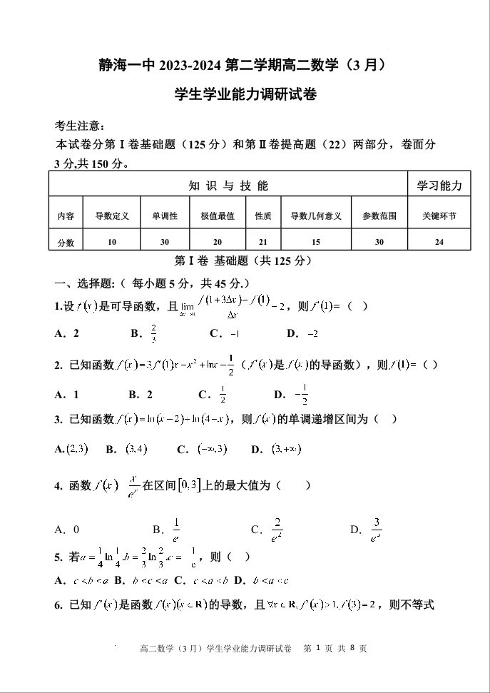 天津市静海区第一中学2023-2024学年高二下学期3月月考数学+答案