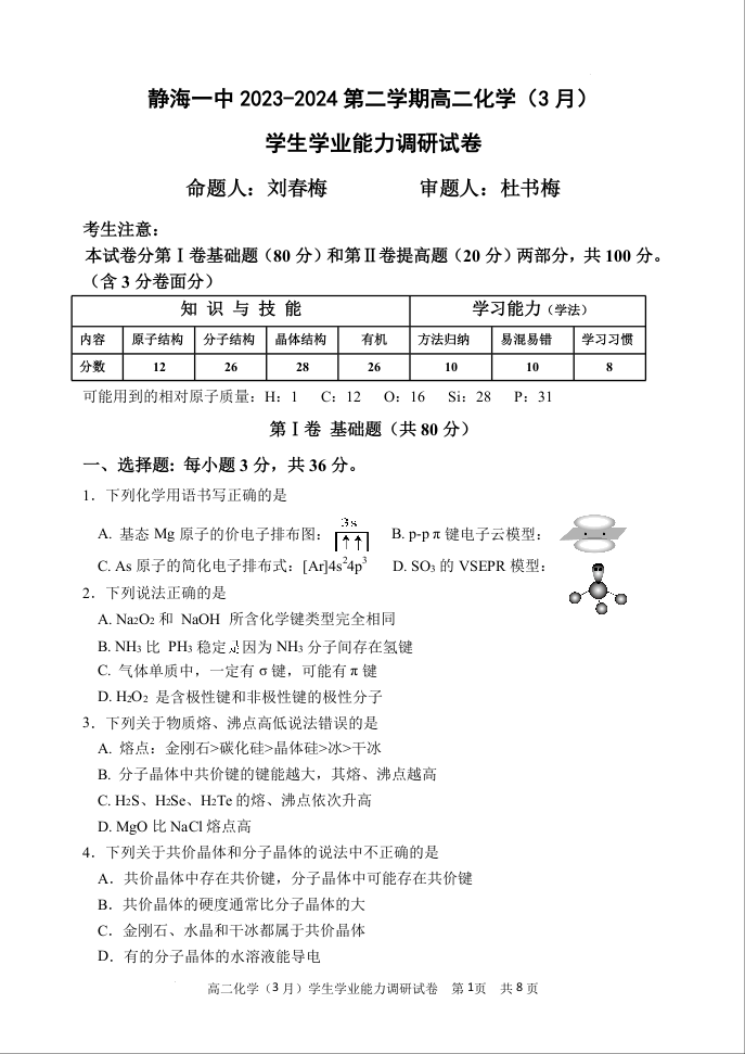 天津市静海区第一中学2023-2024学年高二下学期3月月考化学+答案