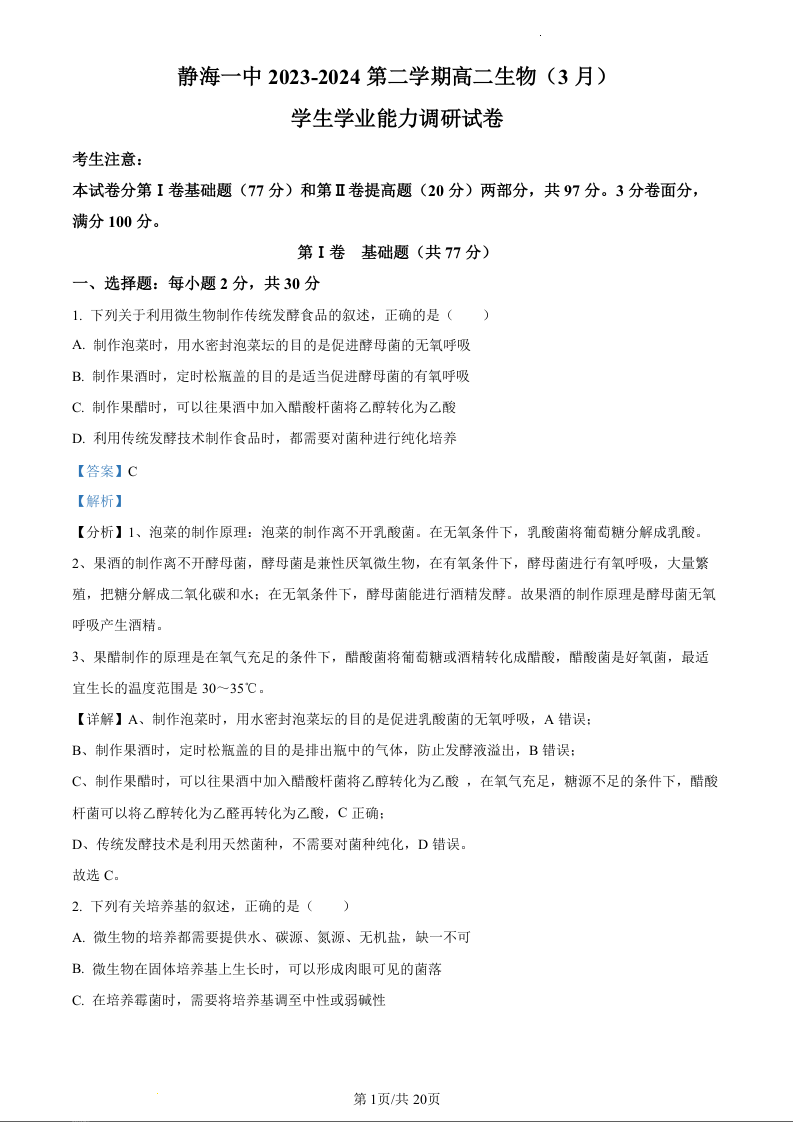 天津市静海区第一中学2023-2024学年高二下学期3月月考生物(精品解析版)