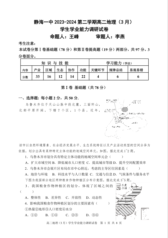 天津市静海区第一中学2023-2024学年高二下学期3月月考地理+答案