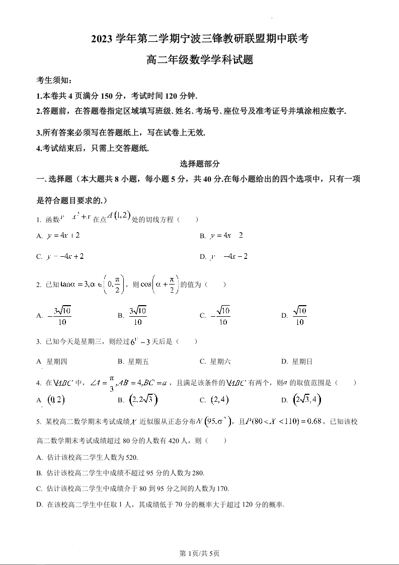 浙江省宁波市三锋教研联盟2023-2024学年高二下学期期中联考数学(原卷版)
