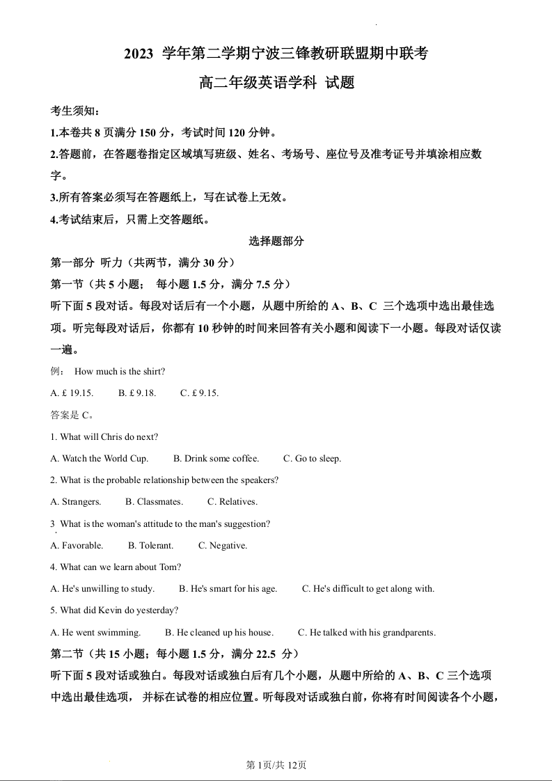 浙江省宁波市三锋教研联盟2023-2024学年高二下学期期中联考英语(原卷版)