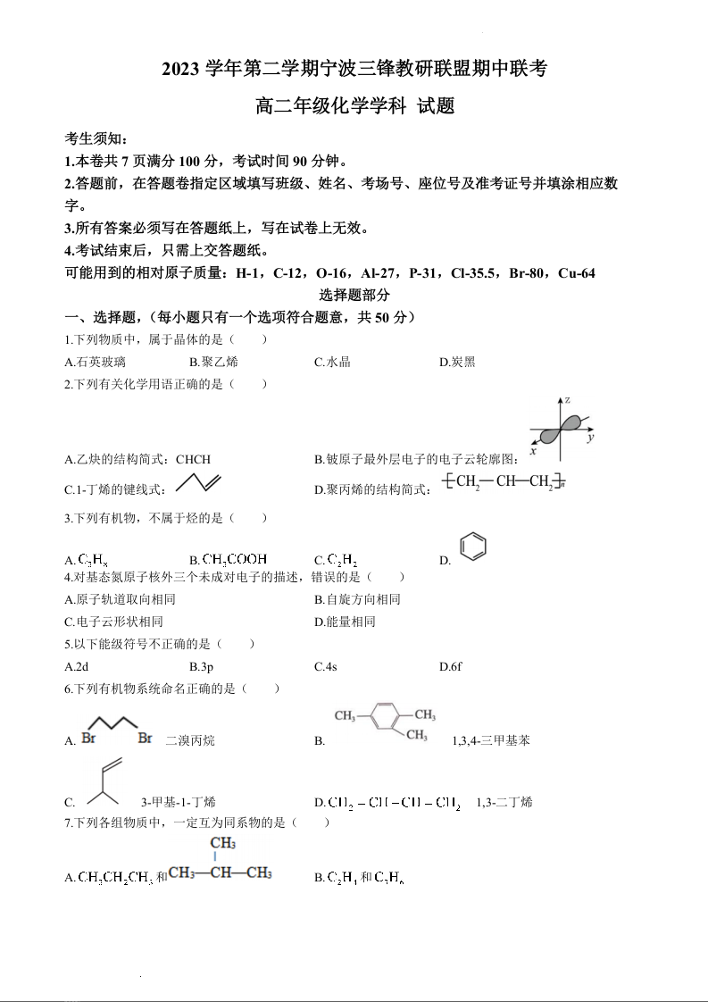 浙江省宁波市三锋教研联盟2023-2024学年高二下学期期中联考化学+答案