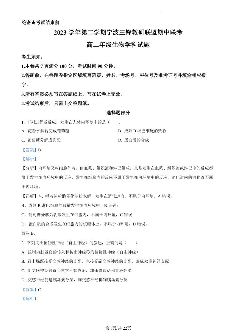 浙江省宁波市三锋教研联盟2023-2024学年高二下学期期中联考生物(精品解析版)