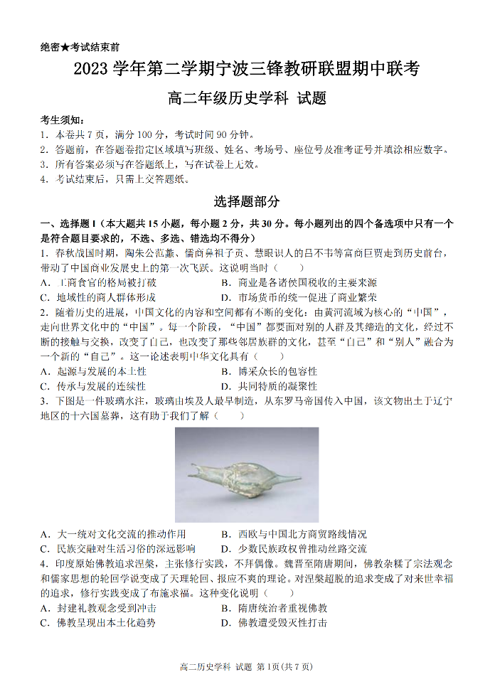 浙江省宁波市三锋教研联盟2023-2024学年高二下学期期中联考历史