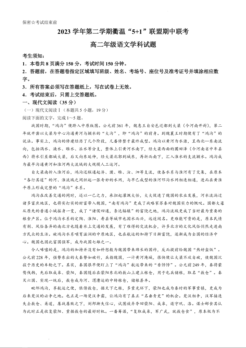 浙江省衢温5+1联盟2023-2024学年高二下学期4月期中联考语文+答案