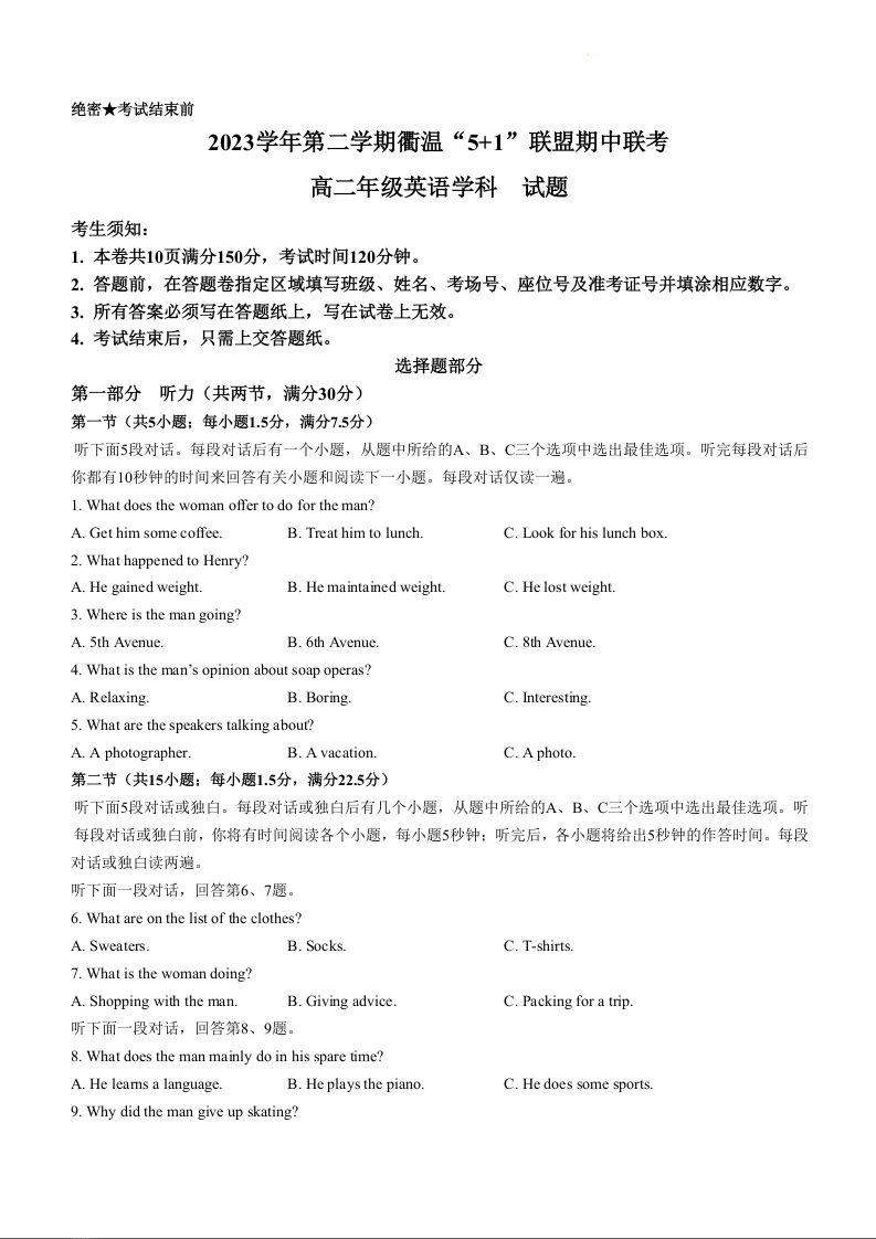 浙江省衢温5+1联盟2023-2024学年高二下学期4月期中联考英语+答案