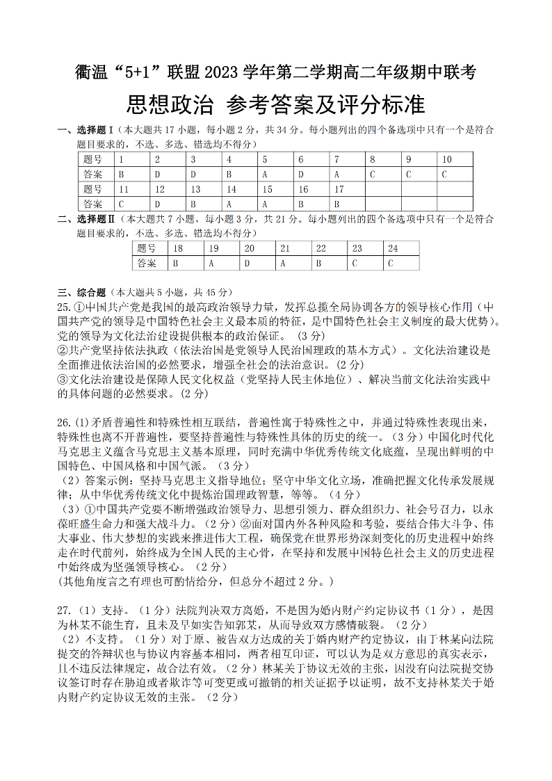 浙江省衢温5+1联盟2023-2024学年高二下学期4月期中联考政治答案