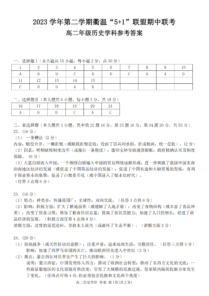 浙江省衢温5+1联盟2023-2024学年高二下学期4月期中联考历史答案