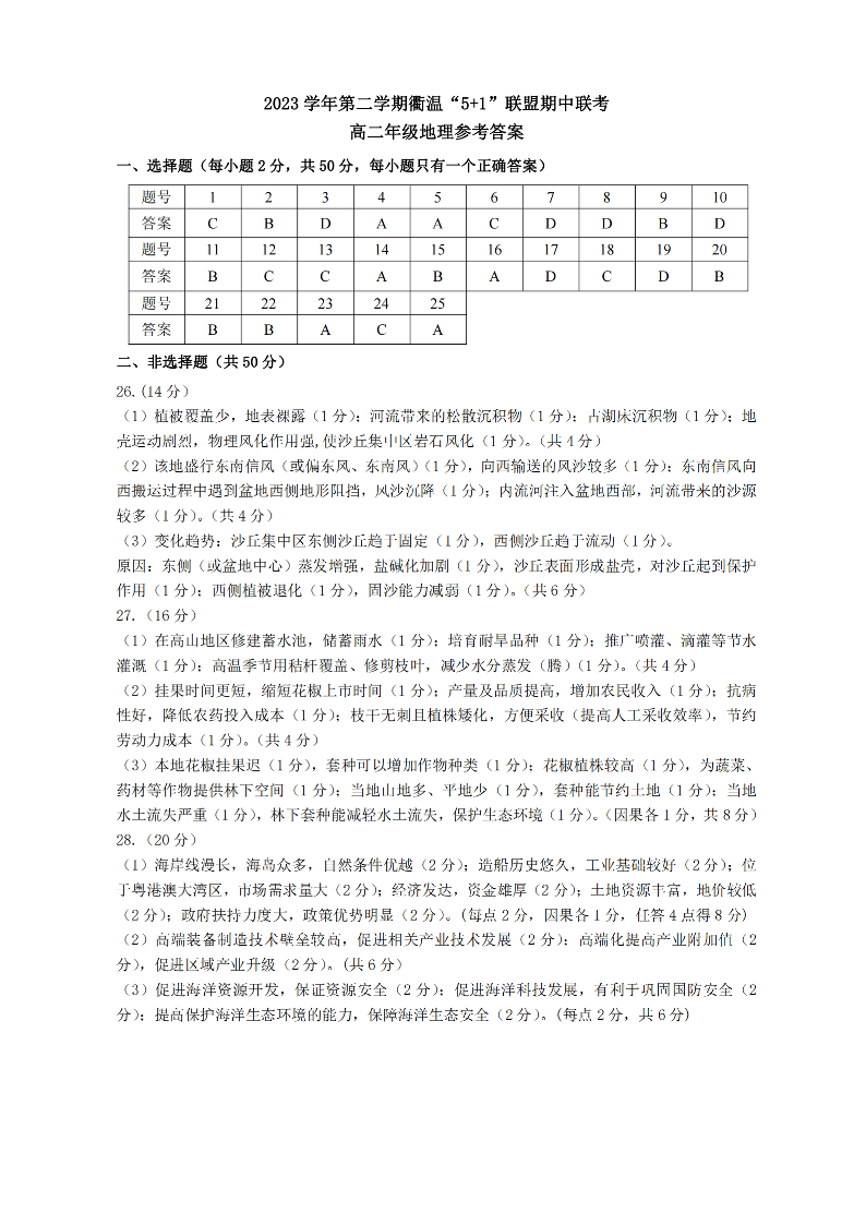 浙江省衢温5+1联盟2023-2024学年高二下学期4月期中联考地理答案