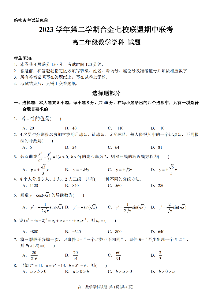 浙江省台金七校联盟2023-2024学年高二下学期期中联考数学