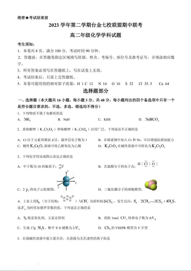 浙江省台金七校联盟2023-2024学年高二下学期期中联考化学+答案