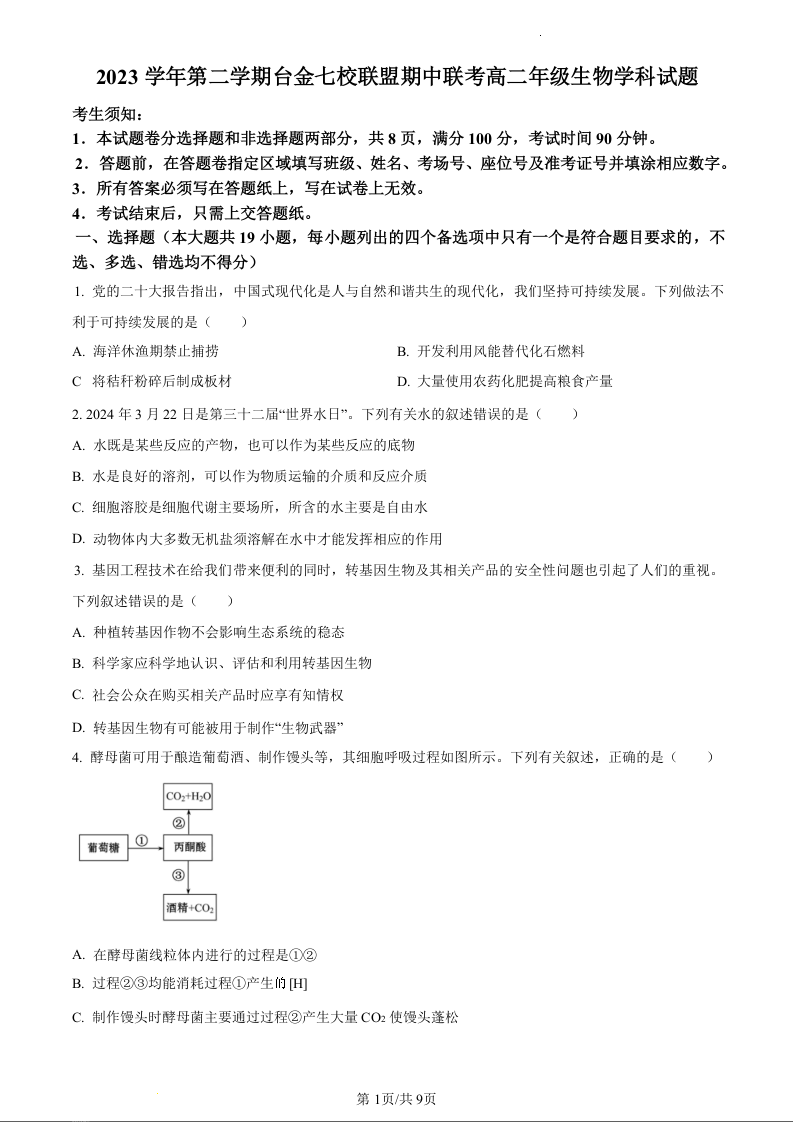 浙江省台金七校联盟2023-2024学年高二下学期期中联考生物(原卷版)