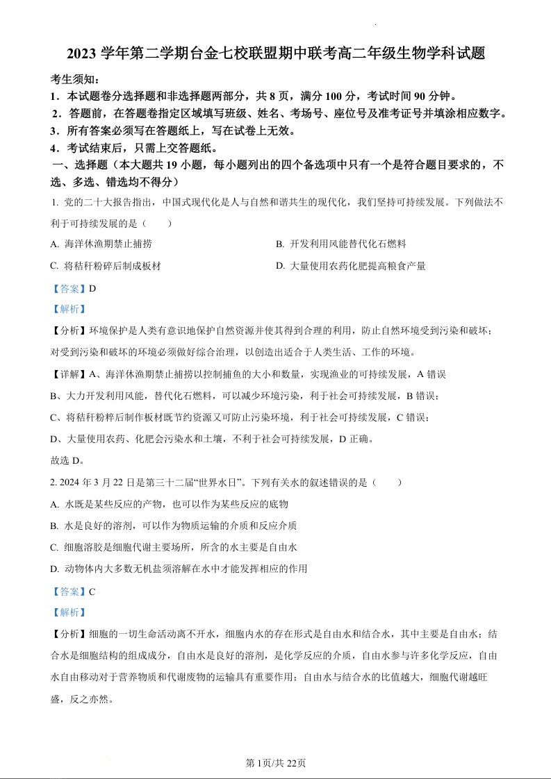浙江省台金七校联盟2023-2024学年高二下学期期中联考生物(精品解析版)