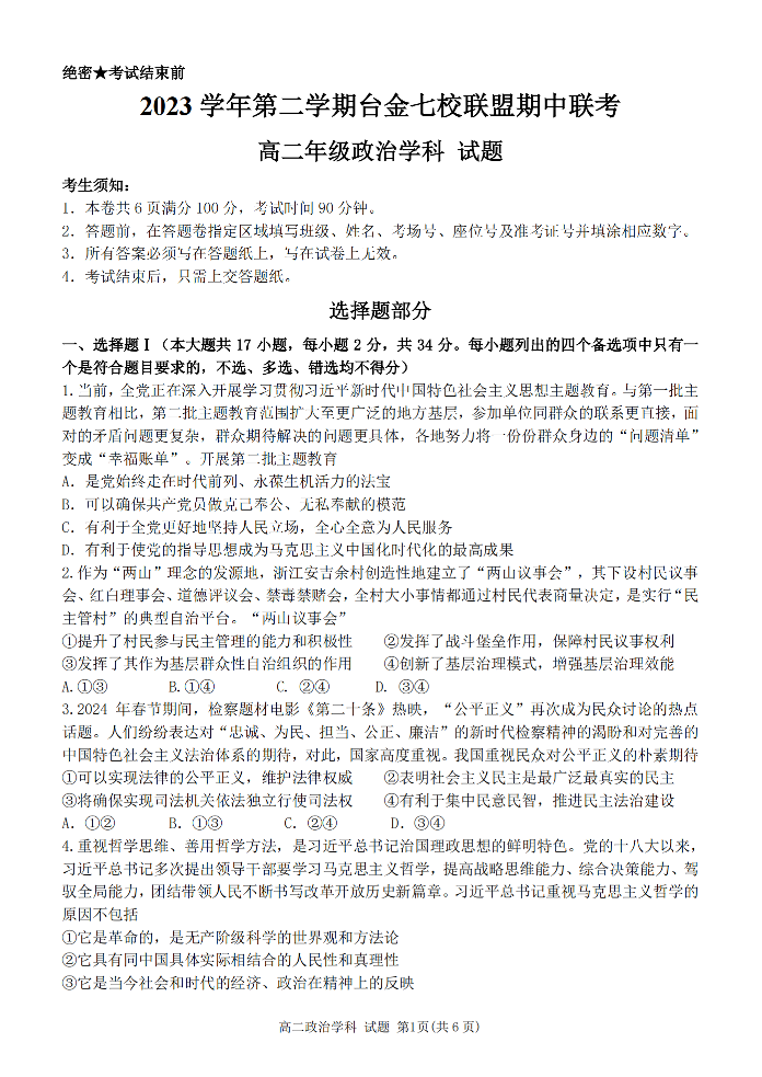 浙江省台金七校联盟2023-2024学年高二下学期期中联考政治