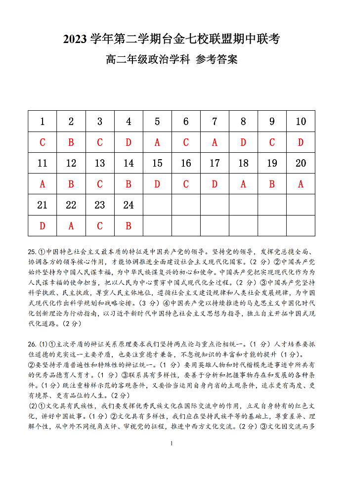 浙江省台金七校联盟2023-2024学年高二下学期期中联考政治答案
