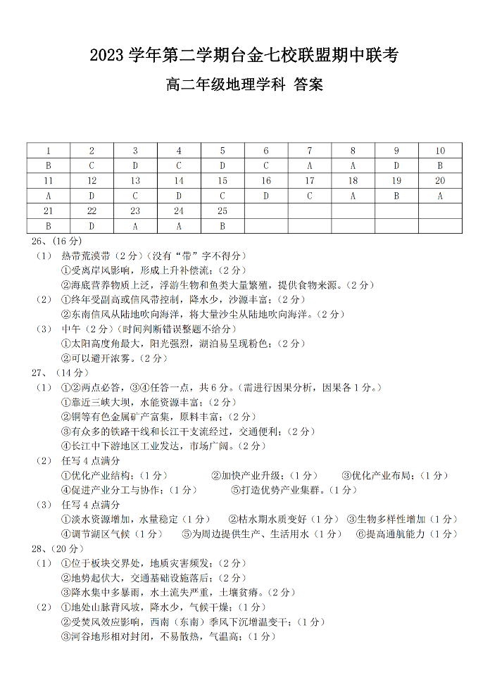 浙江省台金七校联盟2023-2024学年高二下学期期中联考地理答案