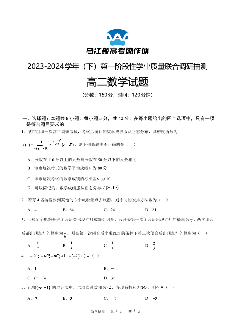 重庆市乌江新高考协作体2023-2024学年高二下学期4月月考数学