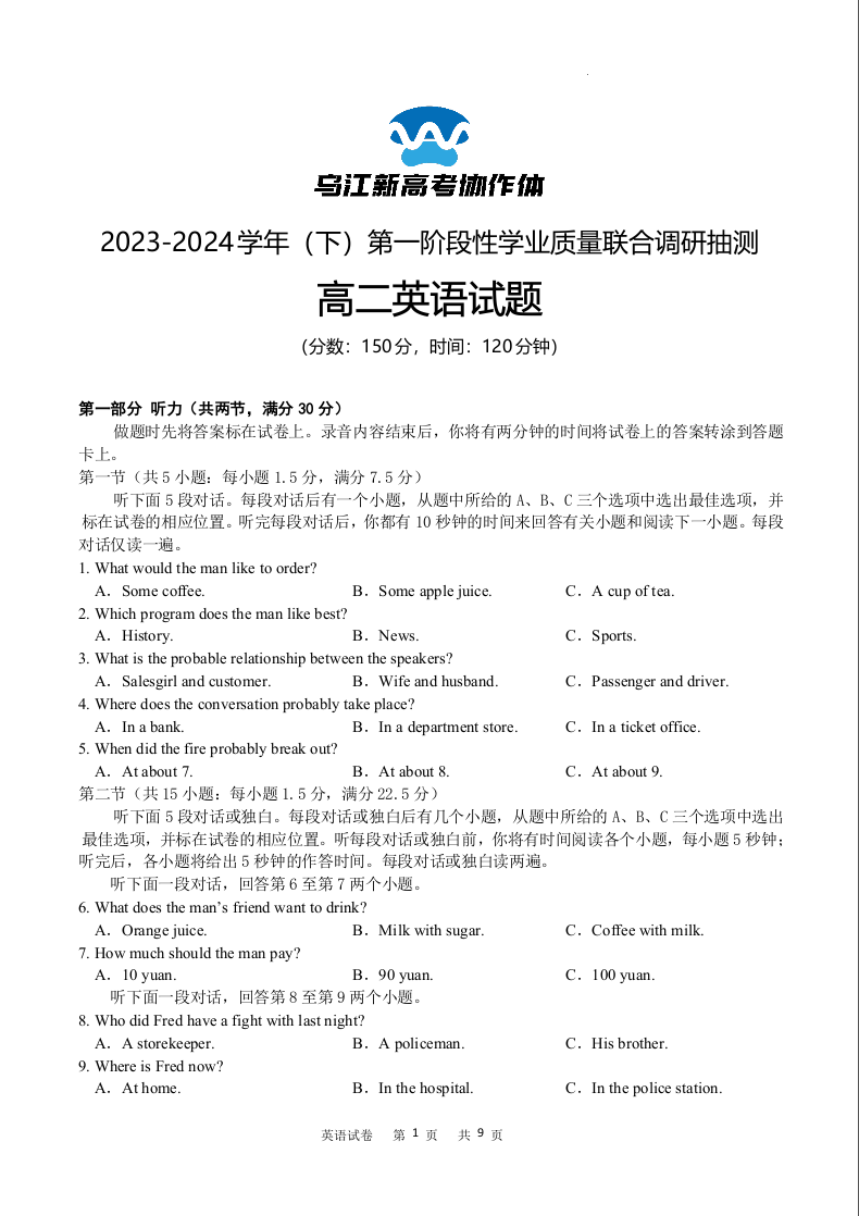 重庆市乌江新高考协作体2023-2024学年高二下学期4月月考英语