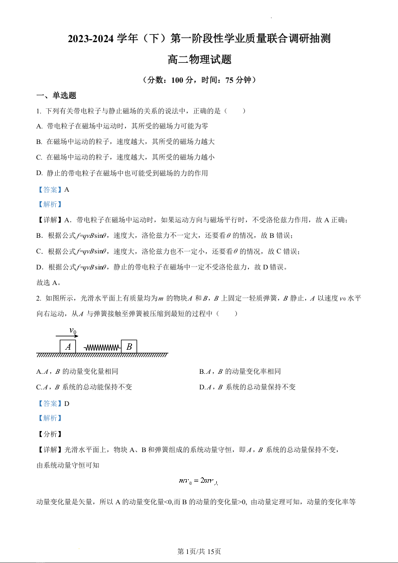重庆市乌江新高考协作体2023-2024学年高二下学期4月月考物理(精品解析版)