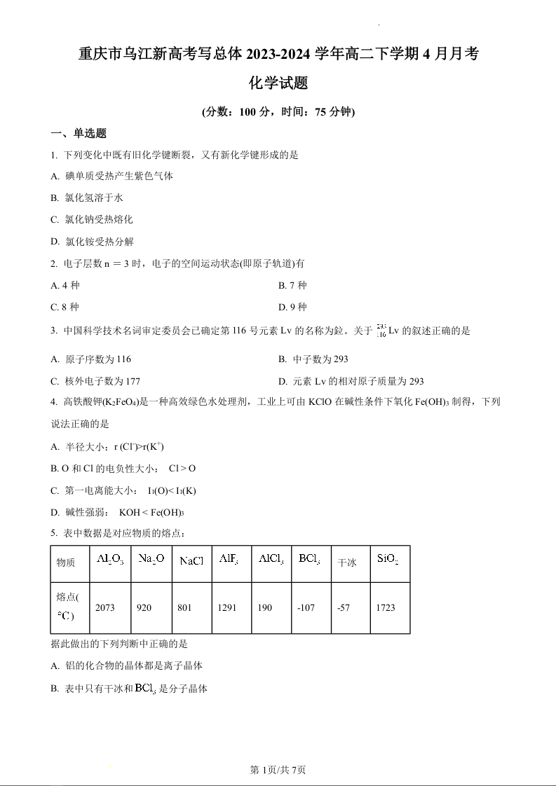 重庆市乌江新高考协作体2023-2024学年高二下学期4月月考化学(原卷版)