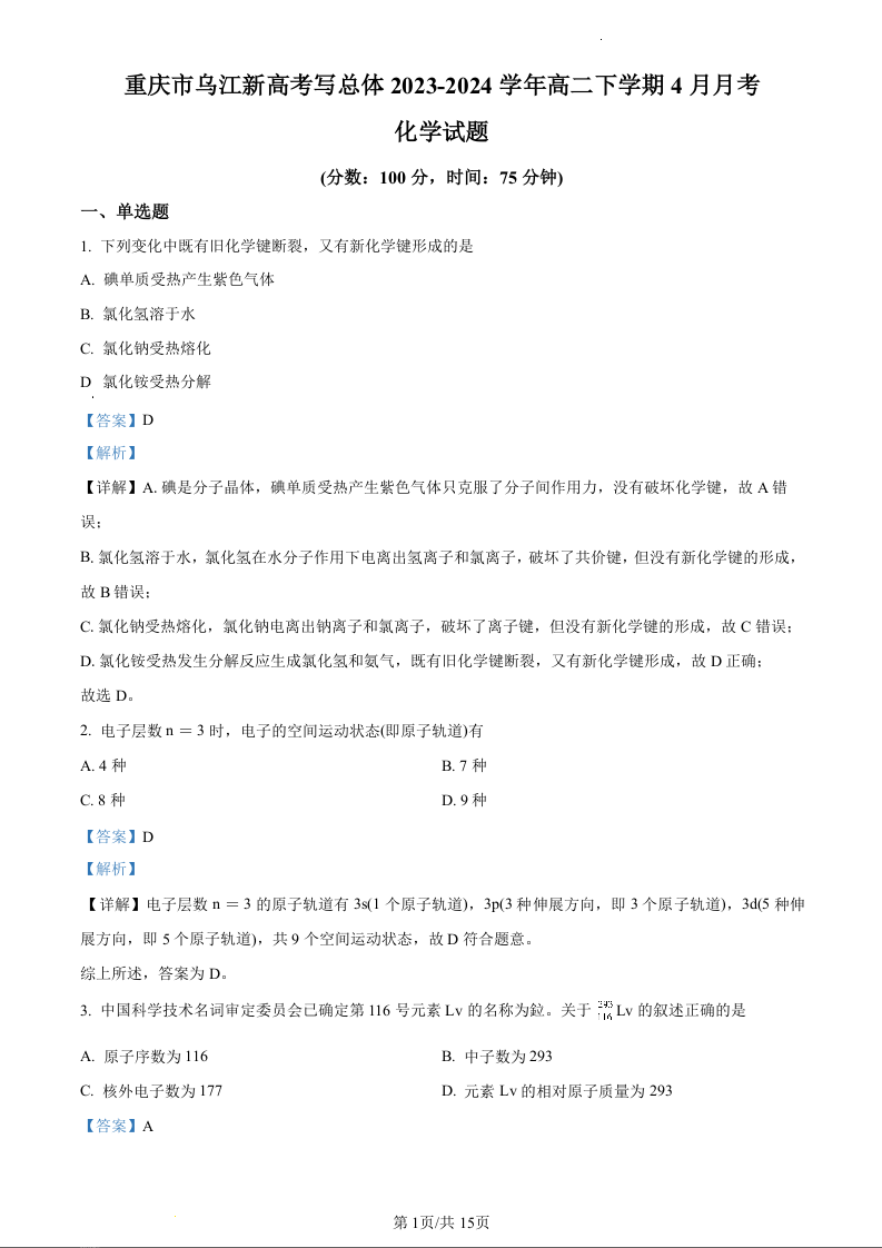 重庆市乌江新高考协作体2023-2024学年高二下学期4月月考化学(精品解析版)