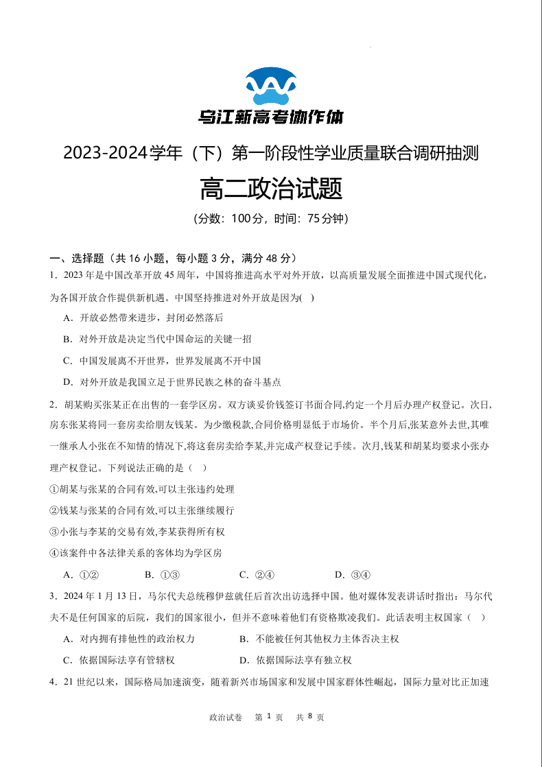 重庆市乌江新高考协作体2023-2024学年高二下学期4月月考政治
