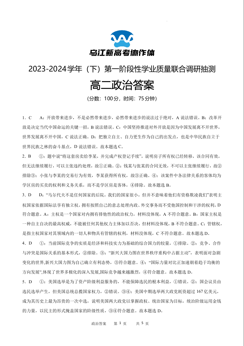 重庆市乌江新高考协作体2023-2024学年高二下学期4月月考政治答案
