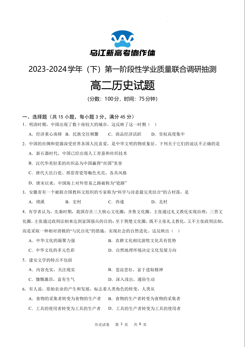 重庆市乌江新高考协作体2023-2024学年高二下学期4月月考历史
