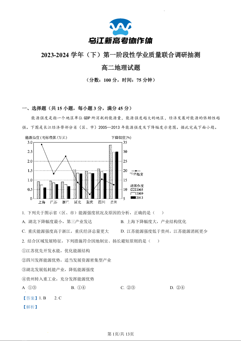 重庆市乌江新高考协作体2023-2024学年高二下学期4月月考地理(精品解析版)